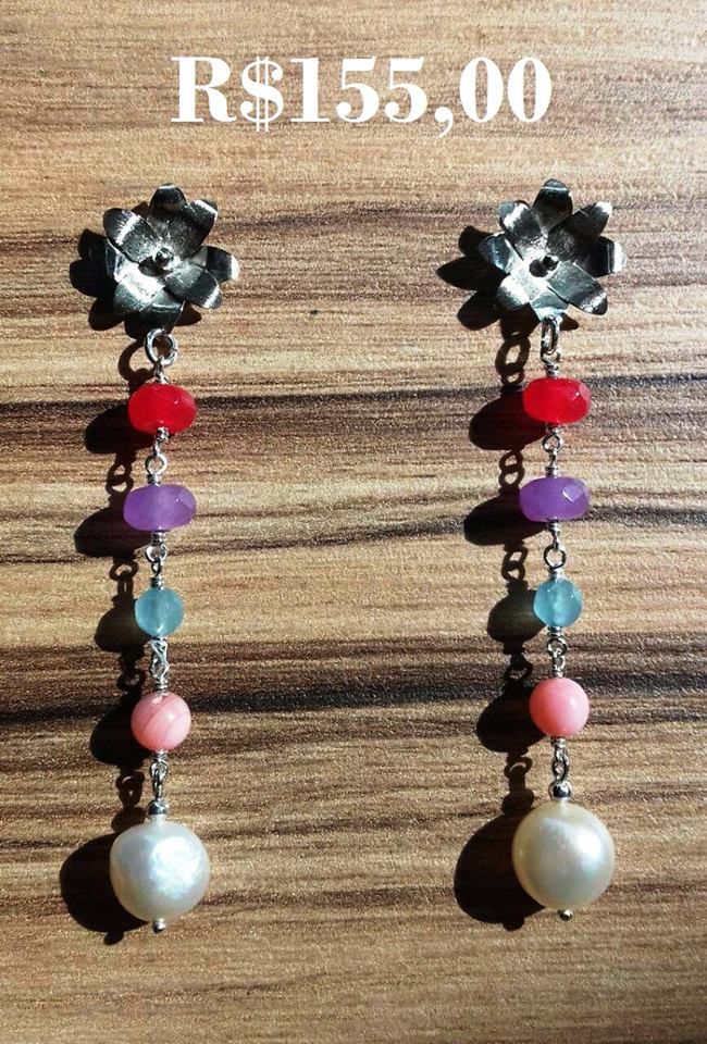 Brinco de prata teor 950k, flor 'bromélia' com pedras naturais lapidação rondel de jade vermelha cereja, jade lilás, jade azul, esfera de madrepérola rosa e pérola barroca creme clara, comprimento 6,6 cm,peso total de 4,7 gramas, valor R$155,00.